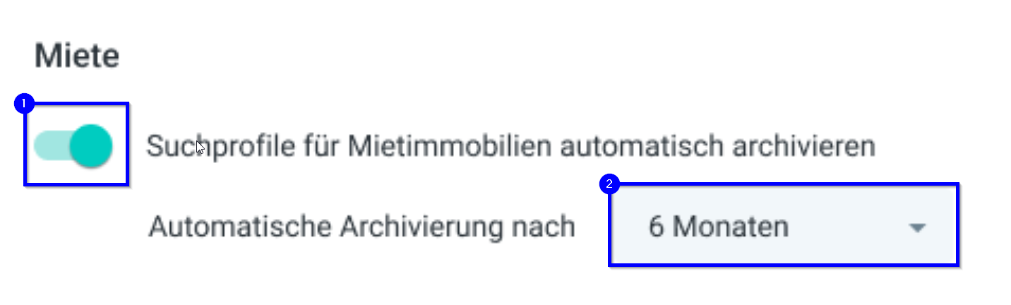 Über den Schalter können Sie die automatische Archivierung aktivieren/deaktivieren (1) und über das Drop-Down-Menü den Zeitraum bestimmen (2). Gemeint ist mit dem Zeitraum, die Zeitspanne, seit der kein Kontakt mit Ihren Interessent:innen stattgefunden hat und das Erstelldatum des Suchprofils. FLOWFACT archiviert alle Suchprofile die älter als der angegeben Zeitraum sind und in denen in der Zeitspanne kein Kontakt mehr erfolgte.