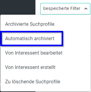 Automatisch archivierte Suchprofile erhalten beim Archivieren den Tag (Merkmal) Automatisch archiviert, um diese Einsehen zu können, gehen Sie bitte wie folgt vor: