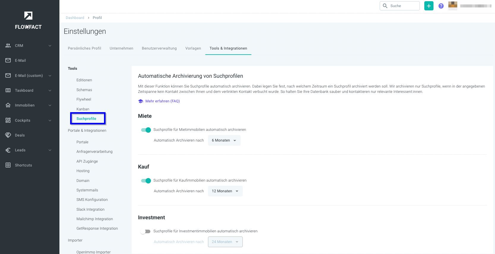Standardmäßig ist die automatische Archivierung von Suchprofilen deaktiviert. Unter Einstellungen > Tools & Integrationen > Suchprofile finden Sie unser neues Menü Automatische Archivierung von Suchprofilen: