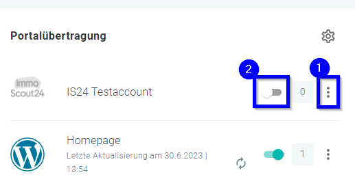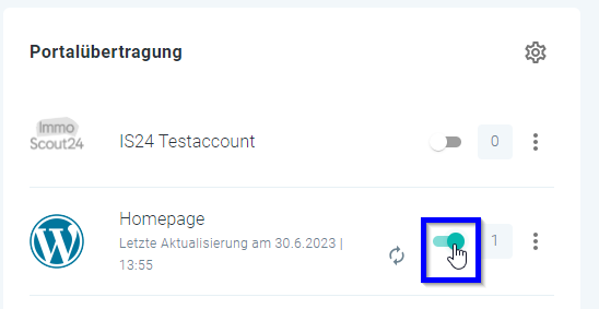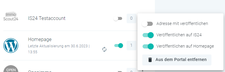 Klicken Sie hierzu auf den grünen Schalter neben den Portal, dann wird die Immobilie vom Portal entfernt und der Schalter wird grau: