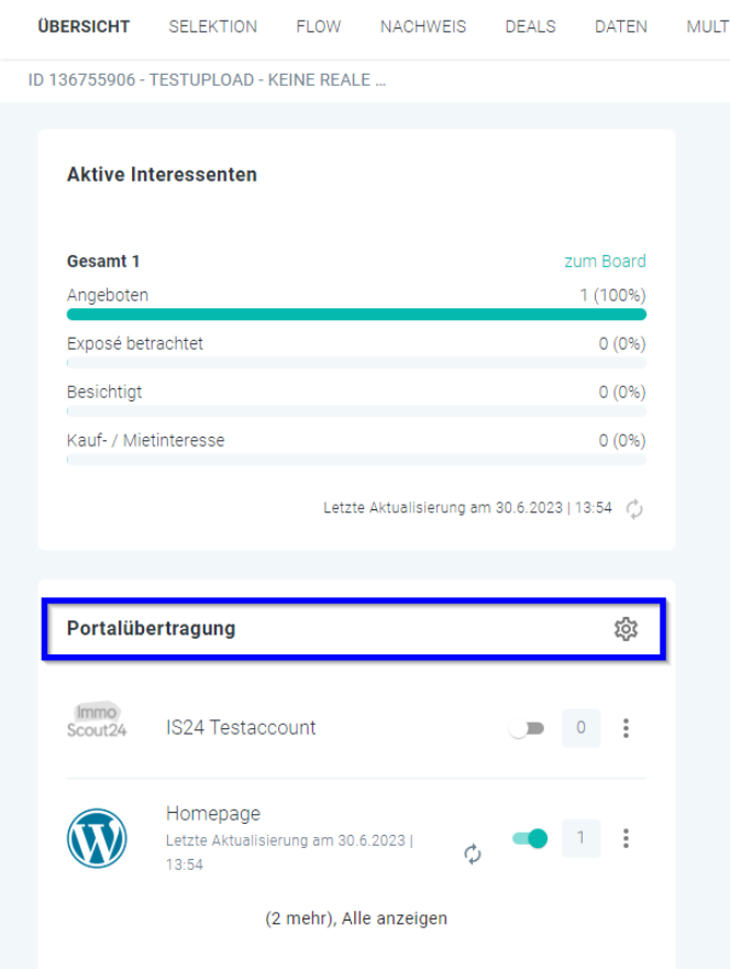 Portalübertragung auf dem Übersicht-Tab der Immobilie