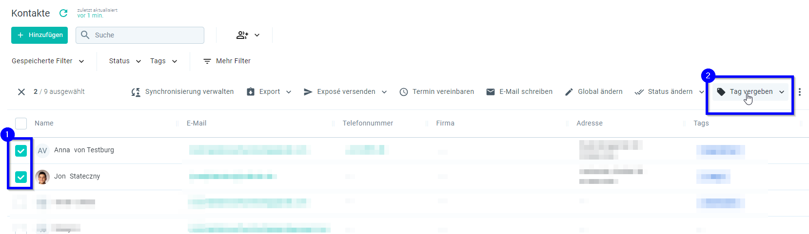 In der Kontaktübersicht unter CRM>Kontakte ist es zudem möglich mehrere Kontakte auszuwählen und mit Tags zu versehen. Wählen Sie hierzu in der Auswahlleiste (Punkt 1) die kontakte aus und klicken Sie dann auf Tags vergeben: