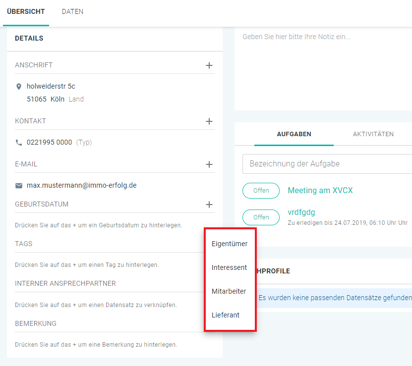 In der Detailansicht eines Kontakts haben Sie die Möglichkeit, mithilfe sogenannter Tags diese beispielsweise als Eigentümer, Interessent oder Mitarbeiter zu klassifizieren.