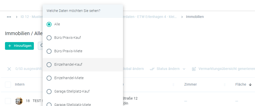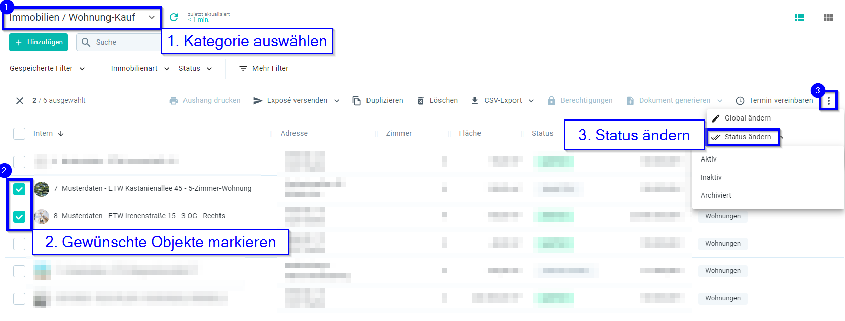 - Selektieren Sie die Immobilien der Liste, dessen Status Sie ändern möchten