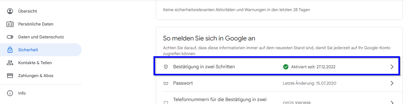 3. Wechseln Sie in das Menü Sicherheit und klicken Sie auf Bestätigung in zwei Schritten. Diese muss aktiviert werden, damit ein App-Passwort für FLOWFACT generiert werden kann.