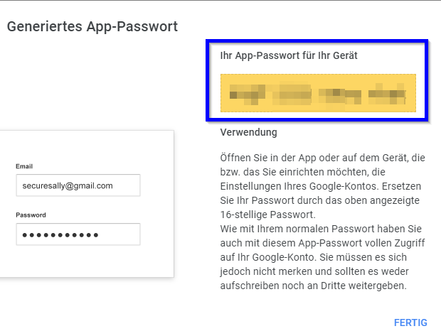 6. Fertig! Im nächsten Fenster erhalten Sie einen Code der anstelle Ihres regulären Passworts für die Einrichtung in FLOWFACT verwendet werden kann. WICHTIG: Sichern Sie das Passwort bitte lokal oder in einem Passwortmanager, in Google selbst kann es nicht erneut eingesehen werden!