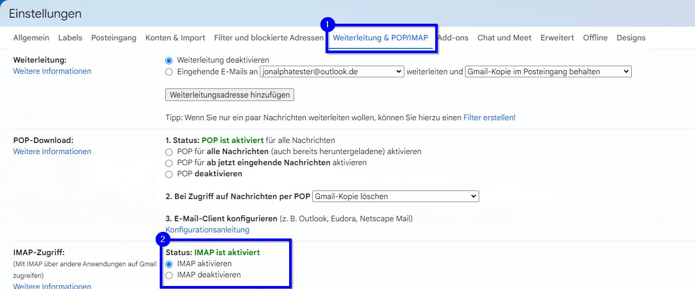 2. Öffnen Sie nun das Menü Weiterleitungen & Pop/Imap und aktivieren Sie den Zugriff via IMAP.