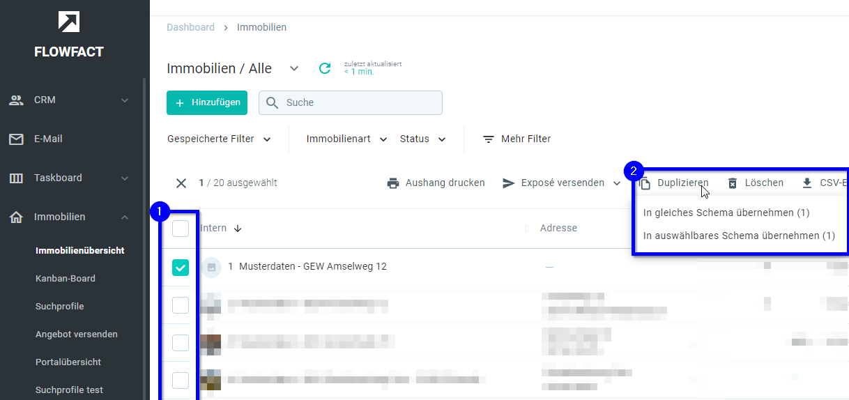 1. Wählen Sie in der Auswahlleiste die Immobilie aus und klicken auf „Duplizieren“