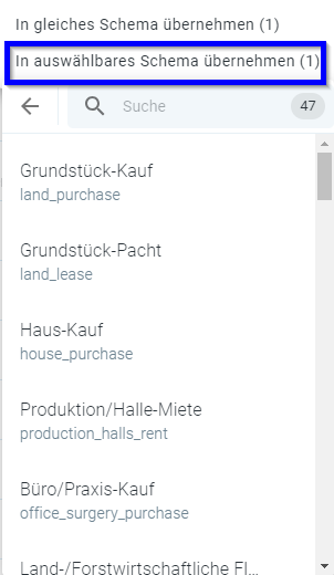 Wenn Sie die Kategorie wechseln wollen bei der Erstellung eines Duplikats, klicken Sie auf „In auswählbares Schema übernehmen“ und es öffnet sich ein weiteres Feld, wo Sie die Objektkategorie auswählen: