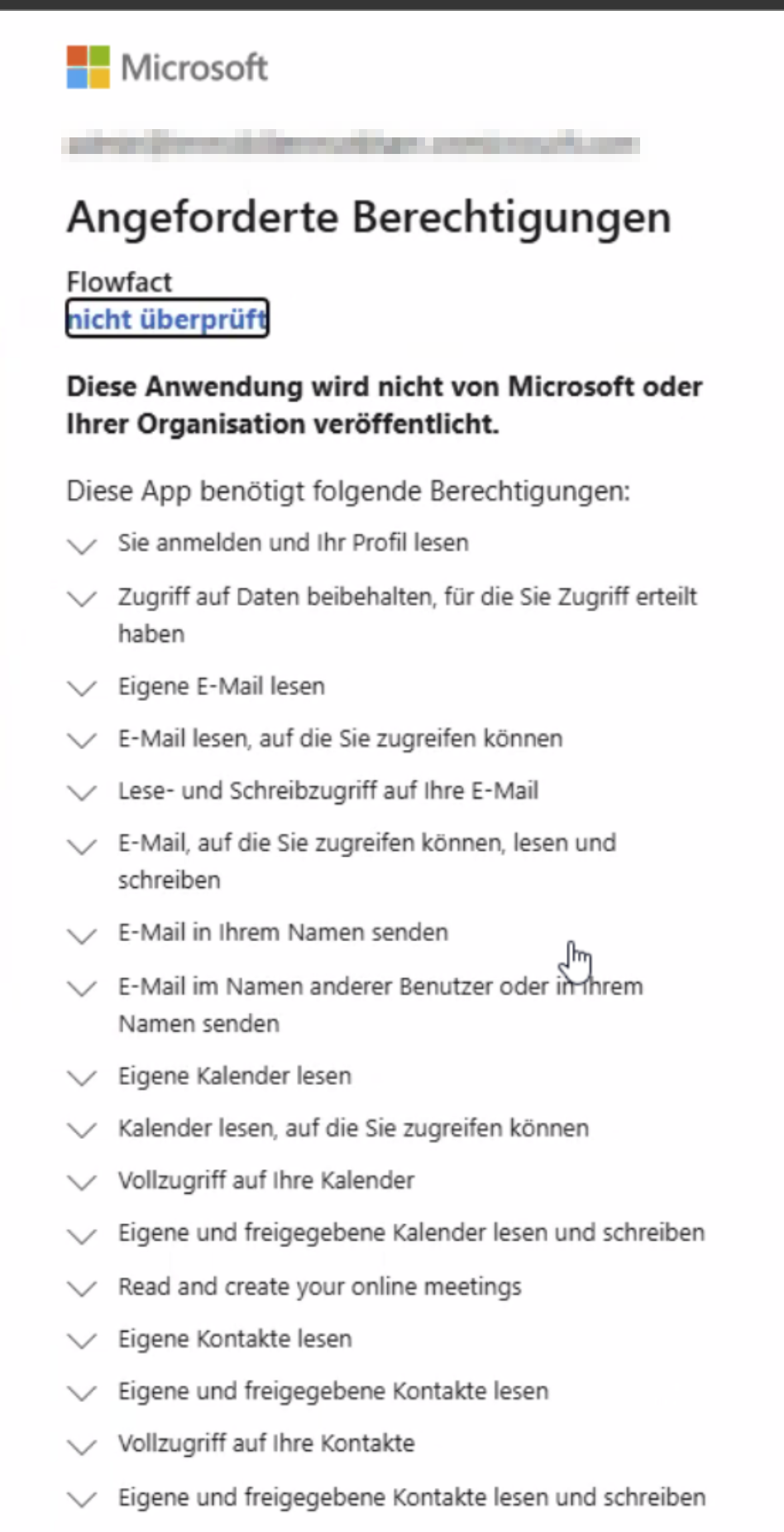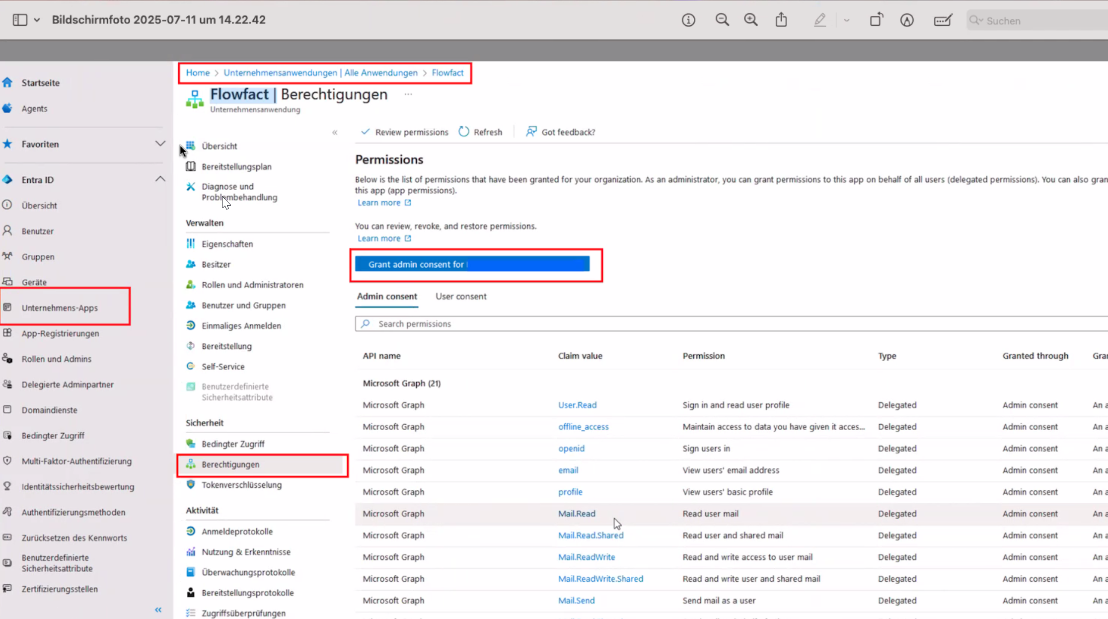 Sollte es weiterhin nicht funktionieren, können Sie unter entra.microsoft.com nachsehen, ob die Rechte gegeben wurden und gegebenenfalls über den blauen Knopf mit der Aufschrift "Grant Admin Consent for (Ihre E-Mail-Adresse)", die Rechte für FLOWFACT erneut vergeben: