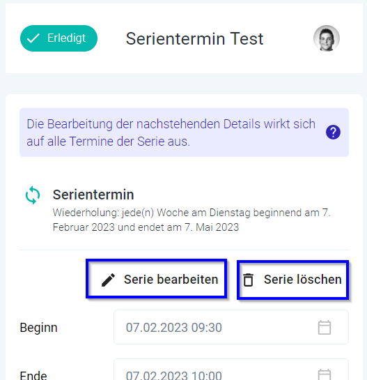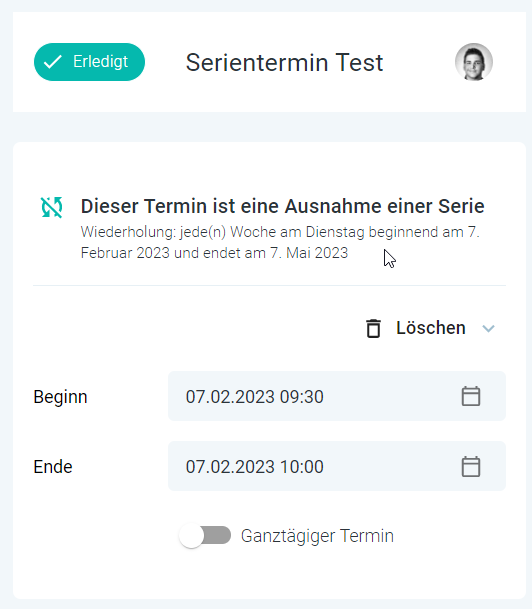 3. Der Termin ist nun von der Serie abgekoppelt und kann bearbeitet, gelöscht oder als "Erledigt" markiert werden, ohne die Serie zu verändern oder zu löschen.